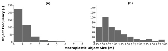 The algorithm also determined the size of each object. Figure 9 presents the object size distributions between 1 and 8 m and a more refined scale distribution between 0 m and 3 m. Most objects are smaller than 1 m in size Figure 9a. On a finer scale, most of the detected objects are in the 0.50 to 0.75 m interval Figure 9b. A sharp drop of object frequency below 0.50 m is in contrast with the expected higher abundance of smaller floating plastic objects [10]. This indicates that the network performance for objects under 0.50 m is irregular, despite its occasional ability to detect objects down to 0.15 cm. Therefore, we selected 0.50 m as the lower level for further GIS analysis and comparisons and omitted the data from objects below 0.50 m.