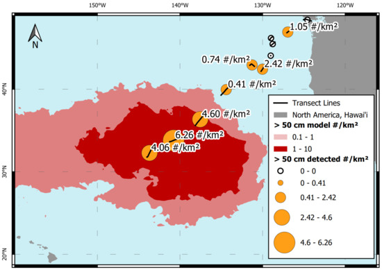As shown in Figure 10, the camera survey observations fall within the numerical concentration values for the >50 cm size class predicted by global plastic dispersal modeling. The large-scale analysis also indicates an increasing gradient of numerical concentration when moving from the western North American coastline toward the GPGP.
