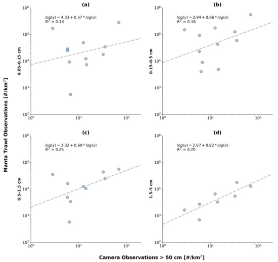 Log-Log scatterplots of Manta trawl observations (y) versus camera observations (x), defined in Section 2.5, for four different Manta trawl size classes: (a) 0.05 cm (lower limit)–0.15 cm, (b) 0.15–0.5 cm, (c) 0.5–1.5 cm, and (d) 1.5–5 cm (upper limit). The text in the upper left corners expresses the linear regression model of each subplot’s log-transformed values and the model’s coefficient of determination (R2) value. The gray dashed lines indicate the fitted regression models.