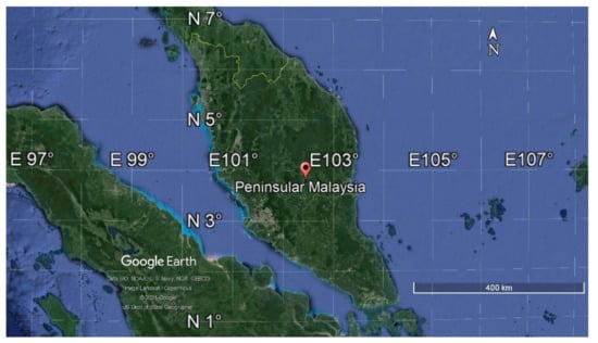 Peninsular Malaysia, also known as West Malaysia, is the landmass connected to Thailand between the latitudes and longitudes of 01–06°N and 100–104°E (Figure 1). This landmass is separated from East Malaysia (the Malaysian states—Sabah and Sarawak) by the South China Sea. It is identified to have a tropical rainforest climate [] with an average of 2400 mm rainfall annually and average temperatures between 26 and 28.7 °C []. Peninsular Malaysia also experiences monsoons, the Southwest Monsoon (April to September) and the Northeast Monsoon (October to March). Within Peninsular Malaysia, the study focuses on the coastal areas where mangroves grow.