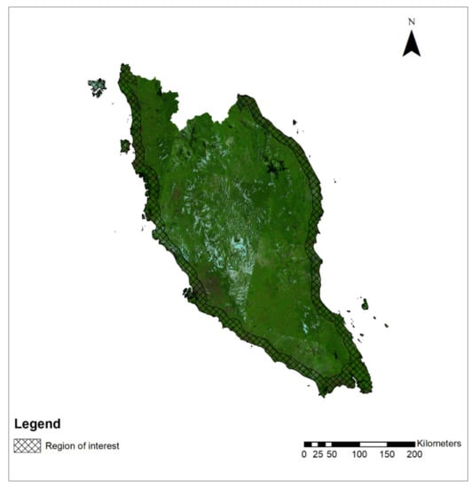 For each year, 14 false-colour composites were produced using the three spectral bands from the Landsat data for each scene. For Landsat 5 and Landsat 7, the Bands 4, 3, 2 (in red, blue, green, respectively) were used to create a false-colour composite while Bands 5, 4, 3 (red, blue, green, respectively) were used for Landsat 8 dataset. A false-colour composite will display vegetation prominently in red while water bodies and urban areas are displayed in black and blue/green, respectively []. It also shows the highest contrast among the land-use types. A mosaic image of Peninsular Malaysia was created by overlapping these composites together and removing the regions out of interest. As mangroves grow in coastal areas, this was chosen as the region of interest for this study (Figure 2). A negative buffer set at 15 km inland from Peninsular Malaysia’s boundary was used to mask out the landmass of Peninsular Malaysia away from the coastal zone and therefore, out of the region of interest for this study.