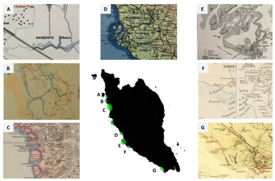 Base map of Peninsular Malaysia showing the locations of historical mentions of mangrove cover (areas in green labelled (A–G) denoted on the black map) with excerpts from corresponding historical maps surrounding the base map. Excerpt A: Map of Penang Aerodome—1932, (Accession N° CO 1047/957, National Archives of UK); Excerpt B: Map of Prince of Wales’ Island or Pulo Penang, and Province Wellesley—1853 (Accession N° CO 700/StraitsSettlements6, National Archives of UK); Excerpt C: A Map of the Malay Peninsula—1898 (Accession N° CO 700/StraitsSettlements31, National Archives of UK); Excerpt D: Escape and Evasion map: Sheet 44F—1944 (Accession N° WO 418/70/3, National Archives of UK); Excerpt E: Hand-drawn map of Langat District in Sir Frank Swettenham’s Malayan journals—1874–1876 (Accession N° 959.5030924, UK Archive Library); Excerpt F: Map of the Malay Peninsula—1879 (Accession N° 4.MIKO, inventarisnummer 1131A, The National Archives of the Netherlands); and Excerpt G: Aviation Map of Malaya—1935 (Accession N° CO 1047/957, National Archives of UK).