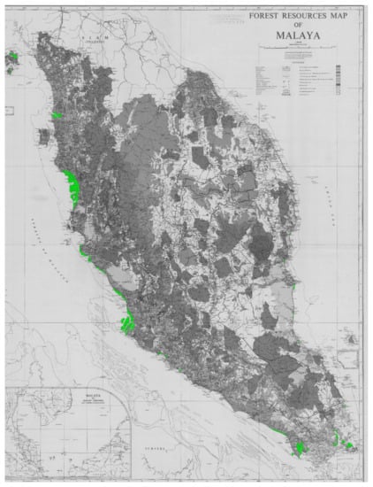 Two maps from the primary sources (Figure 4 and Figure 5) had demarcated types of land use in Peninsular Malaysia, including mangrove areas. As these maps were from the mid-1900s (1943–1944 and 1954), they were very useful in the efforts to detect and interpret mangrove system changes in terms of areal extent in Peninsular Malaysia prior to the development of remote sensing techniques. These maps were georeferenced and accuracy analysis was carried out (RMSE of 1.82 × 10−10 for the 1943-1944 map and 9.33 × 10−10 for the 1954 map). Subsequently, the digitisation process determined the area of mangroves on the 1943–44 map to be 1,389.19 km2 (Figure 4) and 1,129.76 km2 on the Forest Resources Map of Malaya, 1954 (Figure 5).