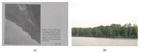 (a) Excerpt from “A Working Plan for Matang Mangrove Forest Reserve Perak, 1995 (fourth revision) by G.B. Keong”—Mangrove forest photographed at Pulau Pasir Hitam, Matang, Perak in 1989; (b) Photograph of mangrove forest at Matang, Perak in 2018 (Source: © Giovanna Wolswijk).