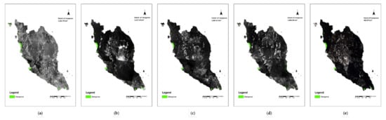 (a) Mangrove cover classification for the year 1988 from Landsat images. © Landsat-5 images courtesy of the U.S. Geological Survey; (b) Mangrove cover classification for the year 1992 from Landsat images. © Landsat-5 images courtesy of the U.S. Geological Survey; (c) Mangrove cover classification for the year 2002 from Landsat images. © Landsat-7 images courtesy of the U.S. Geological Survey; (d) Mangrove cover classification for the year 2012 from Landsat images. © Landsat-7 images courtesy of the U.S. Geological Survey; (e) Mangrove cover classification for the year 2018 from Landsat images. © Landsat-8 images courtesy of the U.S. Geological Survey. The areas in green indicate the detection of mangrove forests.