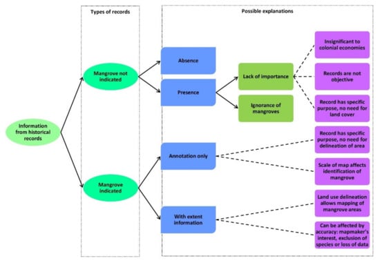 A summary of the types of the historical records found with notations/extent information for mangroves with possible explanations is presented in Figure 8.