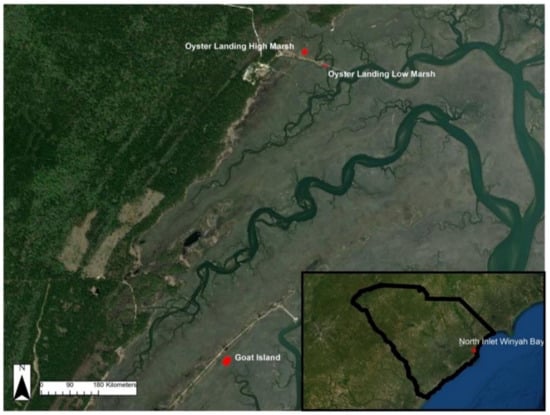 We conducted sUAS surveys at four marsh plots in the North Inlet Winyah Bay (NIWB) estuary at the Belle W. Baruch Institute for Marine and Coastal Sciences near Georgetown, South Carolina, USA. NIWB is a NOAA National Estuarine Research Reserve and home to S. alterniflora-dominated tidal salt marshes. Within NIWB, the North Inlet estuary is 7655 Ha of relatively untouched tidal marsh wetlands. The tidal range for this area is approximately 1.4 m. Three distinct high and low marsh study sites were selected within the North Inlet Estuary (Figure 1). The largest plot is located at Goat Island (GI). The other two plots are located near each other to the north at Oyster Landing. The first is in a high-marsh area (OL-HM), and the second is in a low-marsh area (OL-LM). Each of these plots has been monitored for 30+ years as part of an NSF-funded Long-Term Research in Environmental Biology project, with biomass data collected regularly [].