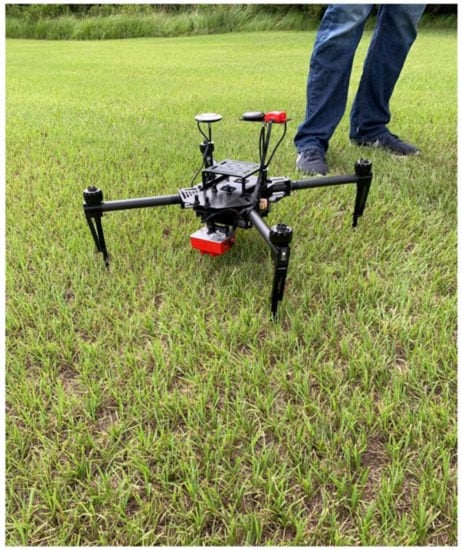 This study utilized a DJI Matrice 100 built with modifications to include a multi-spectral Micasense Red Edge sensor with 5 bands: blue (475 nm), green (560 nm), red (668 nm), red edge (717 nm), and near-infrared (842 nm). The calibrated multi-spectral sensor used in this study provided reliable spectral information to test the concepts of using RGB-indices for S. alterniflora biomass modelling. Regular built-in sUAS cameras have also been used in past studies in extracting RGB indices (more described in the next section). The concepts tested in this study using the multi-spectral camera’s RGB bands apply to an inexpensive, off-the-shelf sUAS RGB camera, although it is expected that the radiometric accuracy is reduced in these inexpensive cameras. Flight time with one battery was approximately 15–17 min, and all missions combined required the use of four batteries. The sUAS came equipped with a Global Navigation Satellite System (GNSS) receiver (Figure 2). Each site required a variable flight path and time, though altitude was held constant at 40 m with a 5 m/s flight speed. The sUAS captured 142 images at the OL-LM site, 198 images at the OL-HM site, and 287 images at the GI site. Overlap (both side lap and front lap) was extended to 85% to ensure that orthomosaics and point clouds could be computed using the structure from motion (SfM) algorithm. Flights were conducted from 11:00 a.m. to 2:00 p.m. EST, centered around low tide (11:49 a.m.) on 30 August 2020. The best time for remote sensing-based biomass estimation is when the species is at peak biomass []. For S. alterniflora, peak biomass is from late July through the beginning of October []. The wind was variable during data collection with 4–6 m/s gusts from the northeast, and cloud cover was minimal.