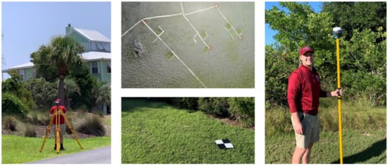 Ground control points (GCPs) were collected using an Emlid Reach RS2 RTK GNSS base station and rover at all three sites (Figure 3). Local GNSS survey markers were used as a base station location to ensure accurate GNSS data collection. To avoid sinking into the difficult marsh, ground control points were placed along walkways previously built for vegetation height measurement and monitoring. A few GCPs were placed in areas of high marsh, very close to shore, to expand GCP coverage around the study areas. Nine GCPs were collected throughout the GI site, six GCPs for the OL-HM site, and seven for the OL-LM site.