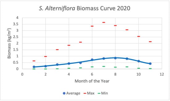 S. alterniflora average biomass curves derived from 29 subplots in NIWB over the year 2020. The peak biomass for each plot varies but ranges from late July to the beginning of October.