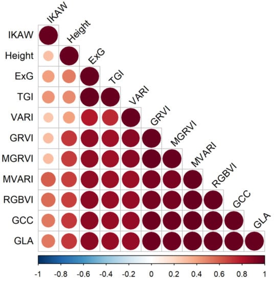 After a thorough review, we discovered that nine of the ten RGB-vegetation indices were highly correlated (Figure 7). The IKAW index was the only index without as high a correlation with other indices and height, but also was not very strongly correlated with biomass. The height variable was also not as correlated with other variables. Following those two, ExG and TGI were both highly correlated with each other, but not as correlated with other indices. The other seven indices we investigated were all highly correlated.