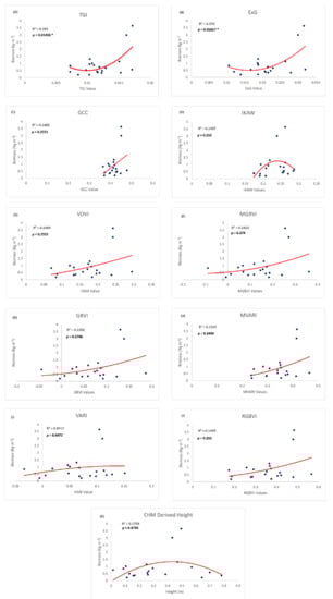Scatterplots and Trendlines for each RGB index and Height metric with the training biomass data. R2 represents the coefficient of determination, and p values are indicated if the model was significant. Asterisks (*) indicate statistically significant models at 0.05.