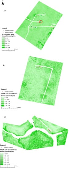 Biomass maps and sample point locations for GI (A), OLHM (B), and OLLM (C) using the ExG-based model. The two samples with the highest biomass (as shown in Figure 8) are circled in red in (A).