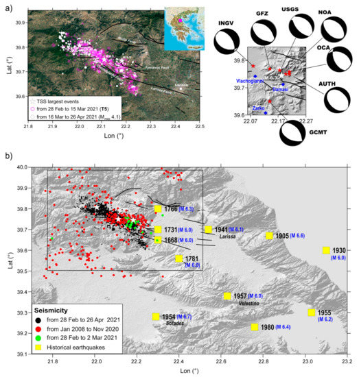 The Thessaly seismic sequence (TSS), Central Greece, started on 3 March 2021 (10:16:08 UTC) with a Mw 6.3 event and struck an area about 25 km WNW of the town of Larissa (Figure 1). Fortunately, it caused no fatalities, while only three people were slightly injured due to the partial collapse of buildings with load-bearing masonry walls in the village of Damasi; moreover, widespread liquefaction phenomena were observed in the fields located close to local rivers [1]. Based on various seismological observatories and institutes (AUTH, NOA, GCMT, USGS, OCA, INGV, GFZ), the first event was characterized by a normal fault mechanism (Figure 1a). Several aftershocks (Mw > 5) concentrated to the southeast during the first few hours after the event within a distance of 10 km (Figure 1a).