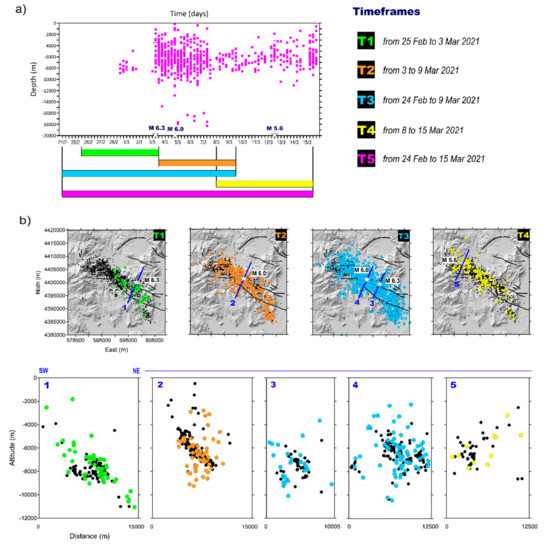 Seismicity evolution. (a) Depth vs. time plot of the seismicity occurred between 28 February 2021 and 15 March 2021; some timeframes used in the subsequent discussion are also shown in different colors (T). (b) Maps and sections of the relocated seismicity plotted according to their origin time. Black dots are the relocated earthquakes recorded until 26 April 2021; subsequent earthquakes are shown with colors reflecting the introduced timeframes (from green to yellow circles). The three largest events are represented by white stars in the upper panels.