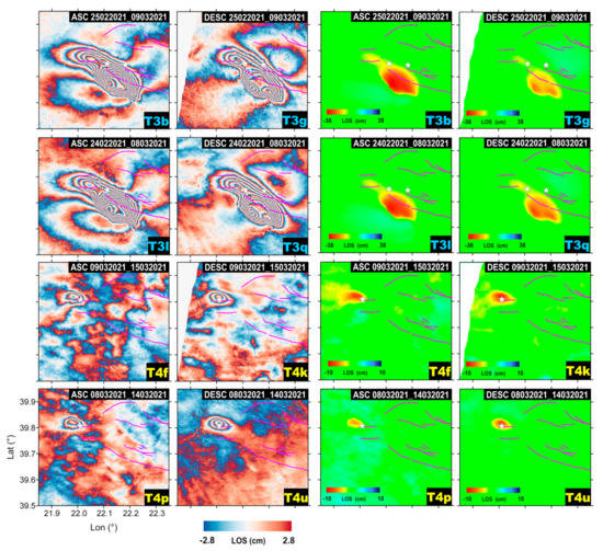 Finally, we introduce T5 as the overall timeframe that includes all three main events; similarly to T3, this was formed by seven interferograms (magenta bars in Figure 2a and Figure S1), which are presented in Figures S5 and S6. Note that multiple interferograms within a single timeframe (Figure 3, Figures S5 and S6) basically comprise the same displacement signal since the four considered tracks were shifted in time by no more than one day and there was no significant activity between the end of February and the beginning of the sequence.