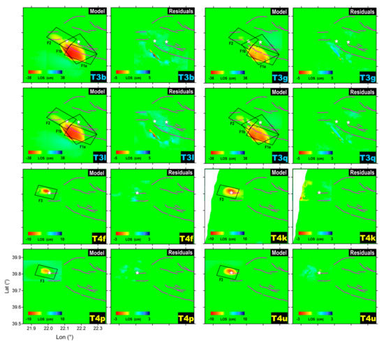 Line-of-sight projected displacement maps computed from the distributed slip modeling (T3 and T4 timeframes) and corresponding residual maps for the S1 interferograms shown in Figure 3. Fault lineaments and the retrieved plain faults are indicated by magenta and black lines, respectively; white stars indicate the epicenters of the three largest events. All the uniform slip modeling results are presented in the Supplementary Materials as Figures S8–S12.