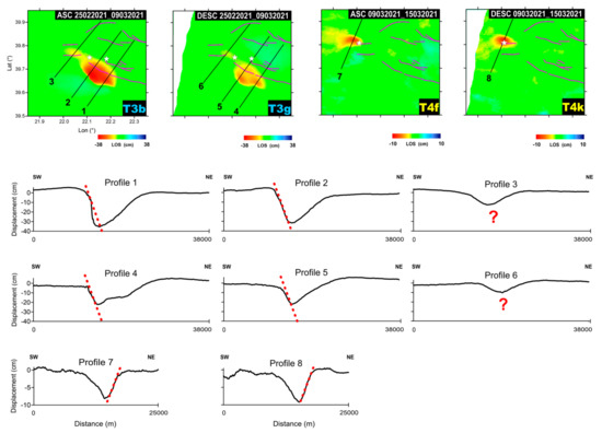 Displacement maps and profiles. (Upper panels) LOS displacement maps for the indicated timeframes together with the selected profiles. (Lower panels) Displacement profiles for Mw 6.3, 6.0, and 5.6 InSAR measurement for T3 and T4; dashed red lines indicate their dipping direction. The question marks in right panels indicate that the displacement in the corresponding profiles did not allow us to discriminate the dipping of the fault plane (Mw 6.0) (see main text for the details).