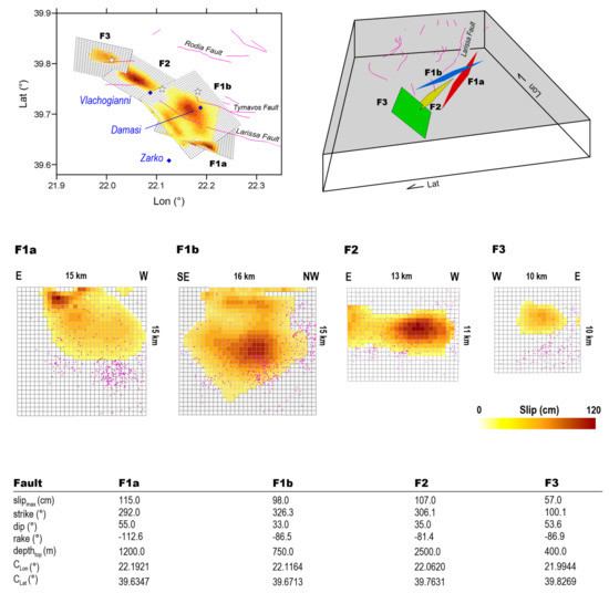 Our model shows that the seismic activity distributed along distinct segments of a previously unknown fault system composed of three fault plains (F1a, F1b, and F2) dipping NE for the Mw 6.3 and Mw 6.0 earthquakes, and of a small fault (F3) dipping SW for the Mw 5.6 (Figure 6). However, the activation of some portion of the known Tyrnavos and Larissa fault during the aftershocks cannot be completely ruled out. The orientation of the retrieved fault plains is in good agreement with the published focal mechanisms by Greek and other international Institutes (Figure 1a), and is in accordance with the extensional tectonic regime of the area.