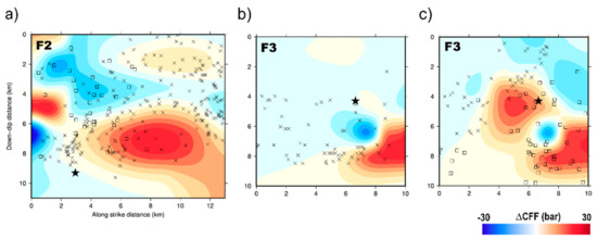 We first considered the effect of the Mw 6.3 event on the fault planes of Mw 6.0 and Mw 5.6. Next, we considered the additional effect of the Mw 6.0 event on the fault plane of the Mw 5.6 earthquake. The first interaction is shown in Figure 7a,b while the second is shown in Figure 7c. The results reported in Figure 7a indicate that the Mw 6.3 earthquake strongly affected the Mw 6.0 by producing a significant ΔCFF increase both east and west of the hypocenter and a slighter increase in the upper right corner that likely promoted its next breaking. Similarly, the Mw 6.3 also increased the ΔCFF in the lower part of the fault plane of the Mw 5.6. The occurrence of the Mw 6.0 increased the ΔCFF in the central part of the fault, leading to the following breaking; notably, the earthquakes that occurred before the Mw 6.0 (reported as square in Figure 7a) seemed to encircle the patches that will slip. Moreover, all the aftershocks (reported as crosses in Figure 7a) occurred in the area that was initially inhibited by the ΔCFF and where remaining stress was released after the main event. Although less evident, a similar picture is depicted in Figure 7c for the Mw 5.6.