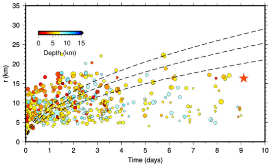 r-t plot for the relocated TSS seismic sequence. Only earthquakes with magnitude larger than the minimum magnitude of completeness (Mc 1.6) were considered. The dashed lines correspond to the triggering front evaluated by using the inferred diffusivity value 60 ± 37 m2/s and plus/minus one standard deviation. Symbols dimension is proportional to the event magnitude and color coded according to the depth. The two stars indicate the Mw 6.3 (light blue) and Mw 5.6 (orange), respectively.