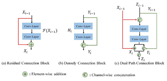 As a combination of residual connection and density connection, dual-path architecture inherits the advantages of both connections, enabling the network to reuse features while excavating new features at the same time [28]. The block structure of the dual-path is shown in Figure 1c. The input of the first layer in each micro-block is divided into two branches, one is element-wise that is added to the residual branch and is represented in red. The other is concatenated with the density branch that is represented in green. After the convolution of the layers, the output is concatenated by the feature maps generated by the dual-path model. Suppose Zi is the i-th layer output of a dual-path structure, its basic structure can be described as: