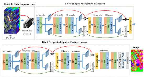 Moreover, Lee et al. [18] proposed a deep context CNN based on the Inception module that was a multi-scale filter bank. The CNN used convolution kernels of different sizes in the first layer to combine and connect the extracted spectral–spatial information. The CNN then used a two-layer residual structure to further learn the spectral–spatial features. Similarly, Bai et al. [19] proposed a spectral-spatial dual-channel dense network (SSDC-DenseNet) to explore high-level features of HSI. In Gao et al. [20], a small convolution and feature reuse (SC-FR) module was proposed. The SC-FR module of their model was composed of two cross-connected layers with 1 × 1 small convolution kernels. The cross-layer combination increased the depth of the model and further enhanced the ability of feature extraction. The model achieved fairly accurate classification. Paoletti et al. [21] constructed a deep pyramid residual network (pResNet) by stacking pyramidal bottleneck residual units that were able to achieve a high classification accuracy.