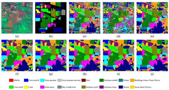 Classification maps of the different models for IP data set: (a) False-color image. (b) Ground-truth. (c) SVM (d) MLP (e) pResNet. (f) SCFR-CNN. (g) SSRN. (h) SSDC. (i) FDSSC. (j) DPSCN.
