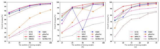 Overall accuracy (OA) of different models with different training samples. (a) IP data set. (b) KSC data set. (c) PU data set.