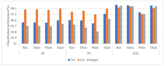 - Effect of DPSC: In order to further verify the effectiveness of the DPSC module, different feature learning path models were constructed. From Equation (3), when r was 0, the number of channels in the DPSC module would no longer be connected by any residual path, and the model would degenerate into a dense network (Dens) with small convolution. If r was 1, the model would be reduced to a residual network (Res) with small convolution. In addition, we specified that plain means not to use any paths. As presented in Figure 11, the results show that the performance of dual-path was better than residual and density paths on the three data sets. Dual-path can further learn the abstract features in HSIs. The main reason was that, through dual-path connection, the DPCN module achieves feature reuse and new features learning mechanism to makes full use of low-level features, which enabled the proposed model to effectively explore more discriminative and robust features of the HSI.