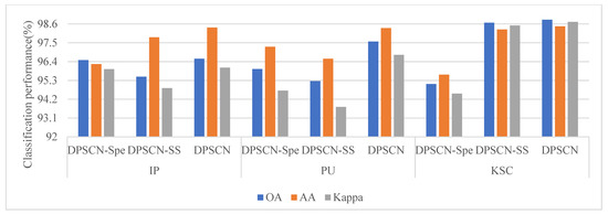- Effect of different feature extraction blocks: To demonstrate the effectiveness of the spectral and spectral-spatial fusion blocks built by the DPSC module in the proposed model, we also tested the performance of networks that only contained the spectral feature learning block (DPSCN-Spe) and the ones that only contain spectral-spatial fusion block (DPSCN-SS). Figure 12 reports the performance of the three networks with the different feature learning blocks. The results stated that the performance of the proposed DPSCN constructed by dual-block was obviously superior to that of the other single-block methods. Therefore, if only spectral feature block or spectral-spatial fusion block were considered, it was not sufficient to extract the discriminative information-objects. Moreover, the DPSC module in the proposed framework could complete the extraction of spectral and spectral–spatial features successively to gradually enhanced the high-level and advanced attributes of HSI data.