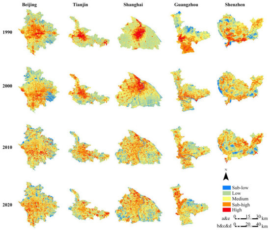 According to the classification results of the remotely sensed LST, the spatial distribution of the urban thermal landscape for five megacities from 1990 to 2020 is shown in Figure 3. The real value of mean LST and the raw Landsat thermal images can be found in Table A2. Figure A2 indicated the large-scale land-cover and thermal landscape maps of Beijing in 1990 and 2020, which illustrated an obvious expansion of impervious surface and more scattered sub-high temperature (S-H) areas (all large-scale images can be found in Supplementary Materials, Figures S1–S3). In 1990, the impervious surface as well as the S-H area mainly concentrated in the urban center, which occupied only 50% of the entire city area. While the impervious surface had continuously swallowed up the surrounding green space and became the absolute dominant land use type during the last three decades. Meanwhile, the S-H area dispersed with the increase of fragmentation degree of green patches, evenly spread over in the city. In general, the dynamic development trend of high (H) and sub-high temperature (S-H) areas in five megacities showed a similar trend. At the early stage of urban expansion in 1990, the H and S-H areas were mainly distributed in the urban central area. With the rapid expansion of impervious surfaces, the H and S-H areas gradually filled the whole study area, which spread continuously along the previous contour. In Figure 3, there is a clear phenomenon in which concentrated heat sources were transformed into numerous scattered but tiny thermal centers, which indicated that the spatial extents of UHI were no longer confined to megacity centers. However, the distribution patterns of scattered thermal patches in the five megacities were significantly different. In Beijing and Shanghai, which mainly expanded with the ring pattern, the H and S-H areas gradually spread around the city center. While the other three megacities mainly expanded in a ribbon pattern, the H and S-H areas generally expanded in one direction: Tianjin moved to the southwest, Guangzhou moved to the north, and Shenzhen moved to the northwest.