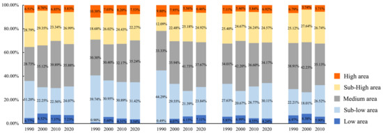 From the perspective of the proportion of various LST levels, the S-H area predominated over the urban thermal environment from 1990 to 2020 (Figure 4). In Guangzhou and Shenzhen, the proportion of medium-, sub-high-, and high-temperature areas decreased slightly from 1990 to 2020. In Beijing, Tianjin, and Shanghai, the area proportion increased from 64.0%, 59.4%, and 55.2% to 68.7%, 65.0%, and 69.1%, respectively. Although the proportion of high-temperature areas in most megacities showed a fluctuating downward trend, it should be noted that the decrease in the proportion of high-temperature areas was not due to improvement of urban thermal environment; rather, it was caused by the increase in the mean LST in the whole study area.