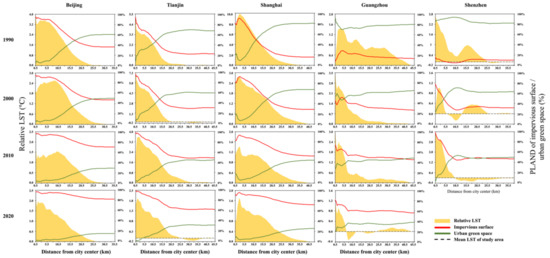 Concentric buffer zones were established to analyze the spatial patterns of both RLST and landscape composition from the city center to rural areas. The results indicated that there was a significant decreasing trend of RLST considering that the PLANDs of different landscape types both had a strong correlation with the urban thermal environment along the urban gradient (Figure 5 and Figure 6), which was also observed in other cities [39,62]. A rapid decrease in RLST corresponded to a sudden increase in urban green space in the buffer zones, which were approximately 10–15 km from the city center of each megacity. The highest decline in RLST of the four periods occurred in approximately 1990, and after that, the slope of the RLST curve gradually became smoother. This phenomenon explained why the high-temperature area showed a decreasing trend, which was observed in Section 3.2. The expansion of urban built-up areas intensified the UHI effect, and the significant high-temperature area was no longer limited to the city center. Notably, the largest increase in impervious surfaces for the five megacities started in 2000, and after that, the shape of the RLST curve transformed from “cliff” to “plains”.