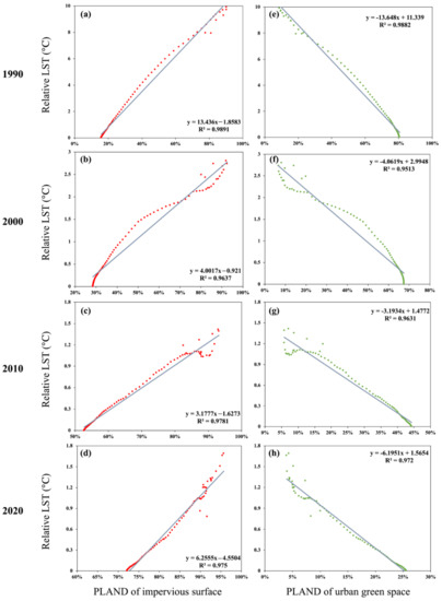 Relationships between the PLAND of two landscape types and RLST in Shanghai from 1990 to 2020. (a–d): PLAND of impervious surface vs. RLST from 1990 to 2020, (e–h): PLAND of urban green space vs. RLST from 1990 to 2020.