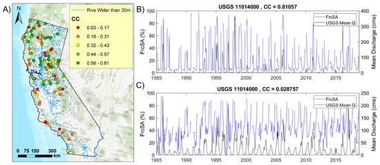 - The Landsat provides consistent observations of over 90% of the river area within bankful widths from March to October, but poor observations from November to February, making it a viable source for monitoring rivers’ seasonal drying dynamics (from spring to fall). When compared with streamflow at co-located USGS gauges, FrcSA shows fair (>0.5) correlation except for in southern dry climate divisions and high-elevation mountainous locations. The 30-m resolution causes potential underestimation of FrcSA during low flow conditions.