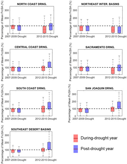 - During the 2012 to 2015 California drought and the subsequent 2016 and 2017 wet years, the rivers in California experienced the two extremes (dry and wet) of regional climatology, which is well reflected by the Landsat observation. The river extents exhibit drastic swings before and after the drought ending. River extent in water-scarce areas is more resilient to droughts because of the high degree of regulation. Rivers in northeast interior basins are significantly dried during droughts and slow to recover after drought endings due to small catchment storage.