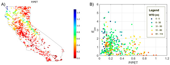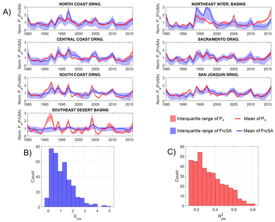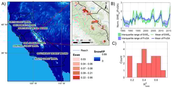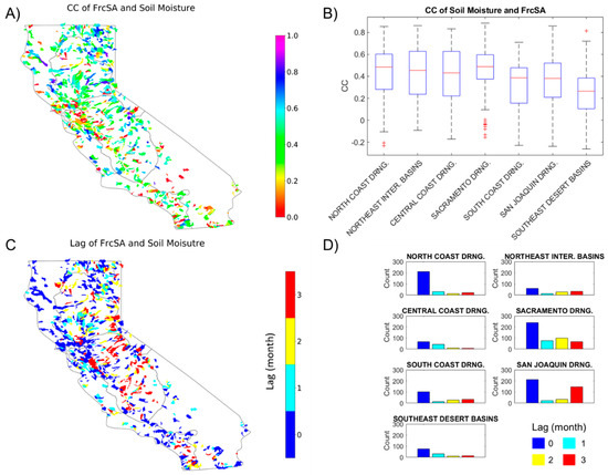- At a monthly scale, soil water, as a component of terrestrial water storage, shows a latitudinal gradient in the correlation with FrcSA: river extent in the humid catchments is better correlated with soil moisture than in the arid southern region. Longer lags of FrcSA following soil moisture are seen in Sierra Nevada than in coastal regions, due to the larger storage of thick soil layers. At a yearly scale, elasticity of summer-mean-FrcSA to winter precipitation (Epw) is statistically significant for over 300 low-order (1 or 2) reaches. Catchments with shallow groundwater table show high elasticity in FrcSA to Pw because their small storge favors fast draining of baseflow. Both correlation and elasticity analyses validate the hypothesis that a storage-discharge relationship controls the dynamics of river extent.