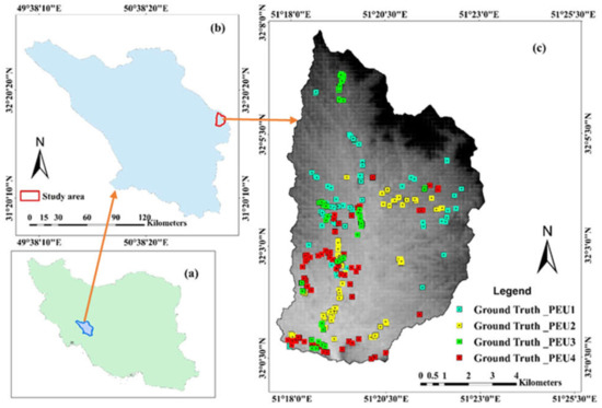 The location of the study area: (a)—Iran border; (b)—Central Zagros border; and (c)—Study area border (Marjan). A set of sampling points of PEUs recorded in the field which later divided into two groups of training (40%) for classification and ground truth (60%) for accuracy testing.