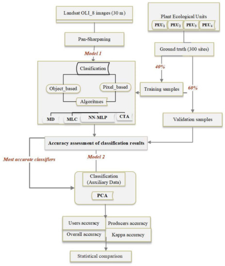 Figure 2 shows the conducted workflow to assess the effects of different classification algorithms for PEUs classification accuracy. As depicted in this Figure, firstly multispectral and panchromatic bands of Landsat OLI-8 images were downloaded and pan-sharpened to modify the spatial resolution from 30 to 15 m. Then, by selecting the most accurate algorithms identified in the previous stage, auxiliary data (PCA) were subsequently incorporated in the second step to improve accuracy of PEUs classification process. So, PCA analysis was run to extract the first three principal components (PCAs) of the raw Landsat bands. The collected field samples were split into training (40%) and test data (60%); the first was used for signature development for classification and the latter for accuracy assessment. Finally, the obtained maps from the different classification algorithms were validated using in-field collected test data.