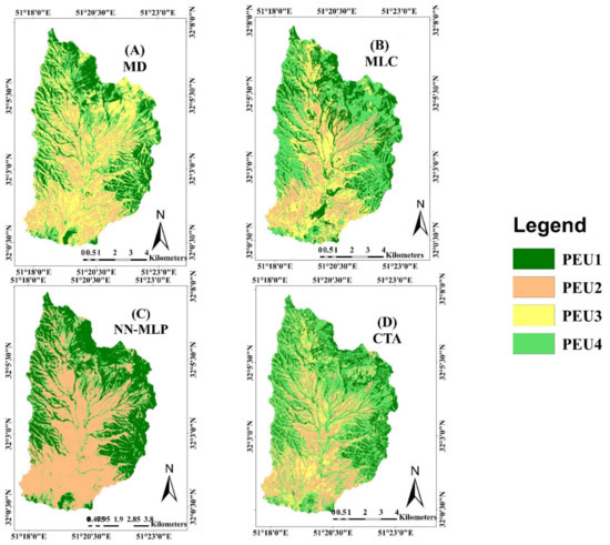 As shown in Figure 3, the four classifier algorithms led to varying classification results. On the whole, the maps as obtained by MLC, MD, and CTA classifiers showed similar spatial patterns of PEUs. These algorithms showed that PEU1 and PEU4 mostly distributed in margins and sloping of the study area. PEU2 is mostly distributed at the center and flat area, but PEU3 is distributed in almost all regions with varying amounts. The map of the NN-MLP classifier allocated flat areas to PEU2 and steep areas to PEU1 and very little to the PEU4. Nevertheless, PEU3 was removed from the study area. The overall accuracy results of each classifier, which is used in pixel-based PEUs classification. The overall accuracy for MLC, MD, NN-MLP and CTA was 78%, 57%, 55% and 67% respectively. The best pixel-based classification results are from the MLC, and machine learning algorithms NN-MLP and CTA cannot improve overall pixel-based classification accuracies.