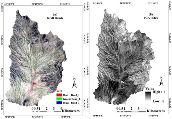 (A) Landsat OLI-8 false color-composite (RGB); (B) PCA Index, used as auxiliary data to improve accuracy in operational PEUs classification.