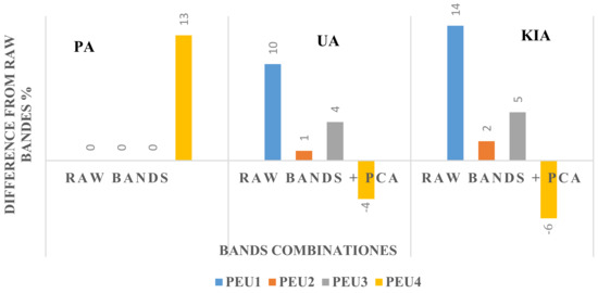 Figure 6 reveals the effect of auxiliary data (PCAs) from raw bands on the accuracy of classification of PEUs. As shown in this Figure, the classification of most of the PEUs were neutral to auxiliary data while PEU4 significantly profits from the auxiliary data in terms of PA. As indicated in figure, all the PEUs significantly profit from the auxiliary data up to 10%, in terms of UA. Classification of most of the PEUs benefits from auxiliary data up to 14% in terms of KIA; however, the auxiliary data negatively affect KIA of PEU4 by 6%.