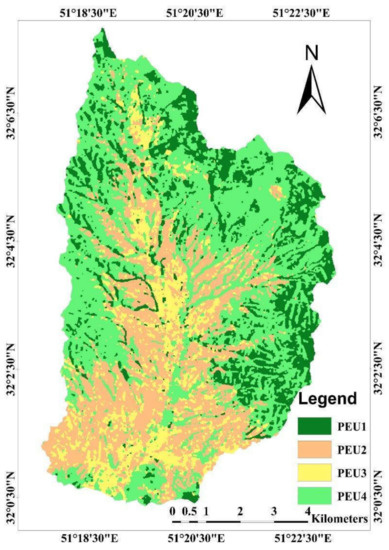 The summary results of confusion matrices for the PEUs classifications achieved from object-based classification algorithms of raw bands (first step) as well as of raw bans and auxiliary data (second step) are presented in Table 3. In this table, producer accuracies, user accuracies, and kappa index of the agreement for each PEUs, overall kappa and overall accuracy of each classification process are reported. When raw bands were applied, PEU4 had the highest UA and KIA with 96 and 95%, respectively. However, PEU2 led to the lowest UA and KIA with 80 and 72%, respectively. The overall kappa was 80 and overall accuracy 86%. Merging the auxiliary data (PCAs) to the raw bands led to the improvement of object-based classification accuracies. The performance of auxiliary data showed that PCA returned the overall kappa accuracy to 85% and overall accuracy 89%. PEU1 led to the highest UA, PA, and KIA with 100, 97 and 100%, respectively, and PEU2 led to lowest UA and KIA with 81 and 74%, respectively when PCAs bands in addition to raw bands were used for classification. The side-by-side comparison of the performance of raw bands and auxiliary data revealed that auxiliary data improved overall accuracy of 5% and overall kappa accuracy of 4% (Table 3).