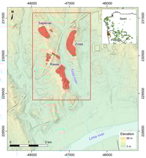 In this framework, the region around the mountain range of Serra d’Arga (Viana do Castelo, northern Portugal), with a high concentration of tin deposit and ancient mining vestiges, is a key area to research, question and integrate common interpretations. For the present study, we selected the sector of the Tinto river valley, a small tributary of the Lima river (Figure 1). It is an area where several ancient mining works have been described in secondary deposits [16,17,18] and where several recent mining concessions for tin are known [19]. In this work, we developed an integrated study to achieve the first large-scale archaeological map of these mining works, ancient and recent, by combining airborne LiDAR data and archived aerial imagery with geological and historical data. Three following alluvial mining sites in the Tinto valley were selected for detailed analysis using remote-sensing techniques: Sapeiras, Zolas and Rasas.