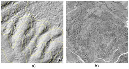 Shaded relief DSM, with overlaid 10-m contours (a) and corresponding orthoimage (b). The area is a square with sides of 500 m.