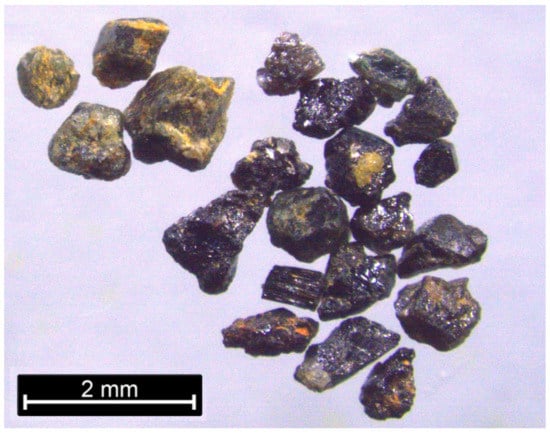 Microphotograph of some grains separated with the gemmologist loupe from fine grain sediments taken at Sapeiras mine. Most of the cassiterite grains are on the centre and right side of the image.