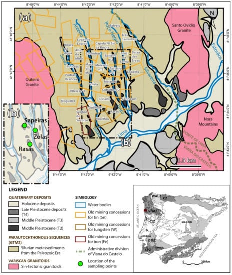 Geological map of the Lima river catchment basin with its Cenozoic sedimentation (adapted from [42]) with (a) the mining concessions of the 20th-century [19] in the municipality of Viana do Castelo (depicted as old mining concessions) and (b) location of the sampling points for Sapeiras, Zolas and Rasas which are over T2 old terraces [43].