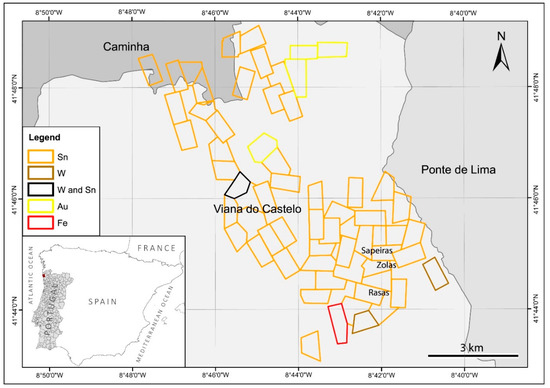 Viana do Castelo municipality and its mining concessions. Data retrieved from the DREN (Direção Regional da Economia do Norte) archives and [19].