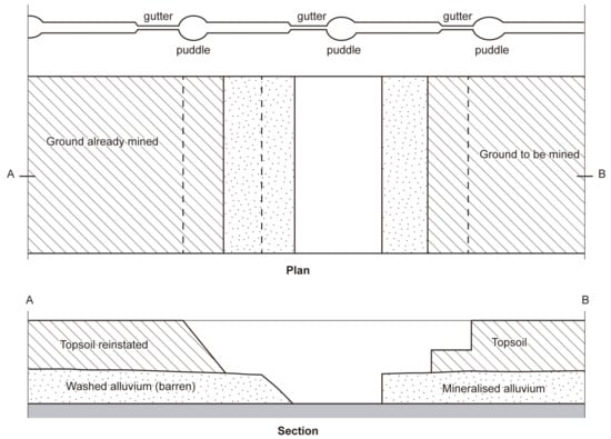 Scheme of alluvium mining based in projects dated between 1940 and 1960 (adapted from [48]). Topsoil is typically within 1.5 to 2.5 m thick.